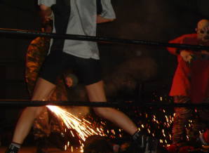 ★だいぶインディーもおいしく食べれる様になったオイラだけど,流石にこの試合は食べれなかったなあ。まずは謎の怪人"ひとごろし"が入場。ひとごろしと言うよりも殺されて生き帰った感じのマスク?包丁で客を威嚇しながら入場もどこか愛嬌たっぷり。場内から"ひとごろし"と声援を受けました。そんで実況にあおられ驚愕の"ひとごろし"コール。俺も叫んだが"ひとごろし"とあんなにおおっぴらに叫ぶって事は人生でもまずないだろうな。とにかくすげえ現象でした。でSKBと飛田選手が入ってそのまま試合開始。で,プロレスとは言えないおそまつな攻防から花火合戦へ。大量の花火がリング内外で火を吹きました。客席も危ないのなんの。マジやりすぎです。でフィニッシュは素人SKBのぶら下がっただけのスタナー...ふっ。こんなのプロレスじゃねえぜ!!って結構...つうかかなり嫌だったな。二度と見たくない試合です。この試合で煙が会場を包み込み進行を悪くするってことも...はあああ。