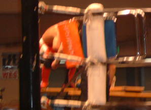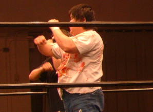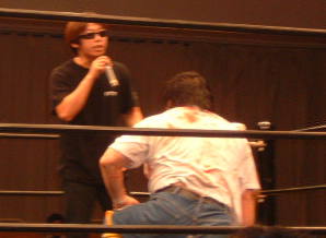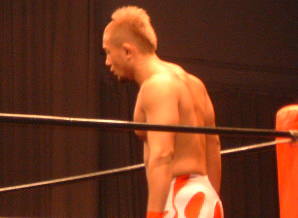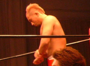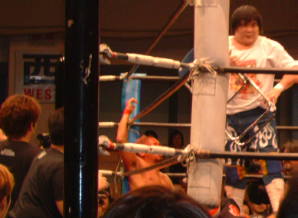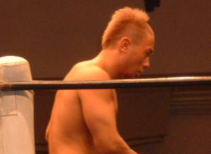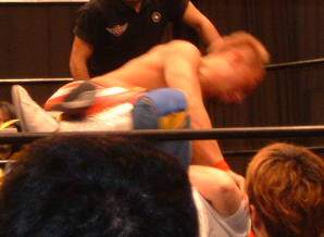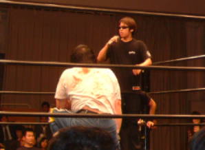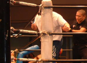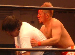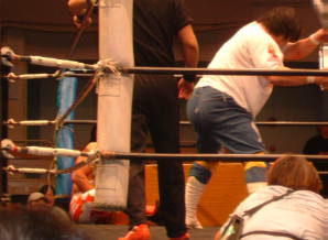 ★一番期待してた試合です。ゴングが鳴るといきなり金村選手が椅子で奇襲。最初はジャーマン等で攻めるもすぐに原選手が逆転。マウントからの張り手などで金村選手を翻弄する。グランドでやられてる金村選手を見かねてセコンドのDJニラがタオル(Tシャツ)を投げるそぶりも。まず序盤は原選手が主導権を握ります。しかしすぐに金村選手の独壇場となりました。反撃を開始するとなんとレフェリーにリバースDDT!オーマイガッ!!レフェリーが悶絶している隙に場外戦に。場外でははさみで原選手を流血に追い込み椅子やテーブルをリングイン。股間テーブルで潰しや椅子の山へのTFPBで攻めたてます。なんとか原選手がキックで逆襲。原選手のハイキックと金村選手の張り手合戦から原選手がハイキックでダウンを奪う。そこから逆襲。連続ジャーマン3連発でダウンを奪いました。しかし流血とスタミナ配分が上手くいってないからかグリップが甘く致命傷までは与えられず。フラフラな原選手が死力を振り絞りスリーパー!!ガッチリ極まる。しかし金村選手のセコンドのニラ選手がエプロンに上がりレフェリーに文句。その間に金村選手がタップアウト。勝ったと思い勝利の雄たけびの原選手。しかしレフェリーが見てなかったので試合続行。金村選手が1枚も2枚も上手だった。もう力の残って無い原選手に金的をくらわすと金村選手の独壇場。TFPB,椅子山へのデスバレーで終わりかと思いきや何度も立ち上がる原選手。すばらしいガッツだぜ。会場も原選手頑張れと後押しする。女性ファン等は「もうやめて~」等悲痛な叫びだ。懐かしくもあり嬉しくもなる声援だったなあ。しかし最後はバトルールを最大限に利用した金村選手の場外のテーブルへのブレンバスターでKO。原選手もついに力尽きた。普通に考えたら素晴らし内容だろうけど原選手にはもっと高いものを期待してた為想像以上でも以下でも無い想像道りの試合でした。原選手にはもっと引き出しやプロレス流の呼吸をしっかり身につけてもらいたい。やはり実戦があまりにも少ないのがいけないんだろう。もっと実戦をこなし凄いレスラーになって欲しい。頑張ったし闘志を失わず目も生きていたんだけど。金村選手が原選手の持ち味をあまり引き出せなかったのは流血で原選手が予想以上に動けなくなったからかなあ。マスク,ハート,ボディーと人並みはずれた素質の持ち主なのだから。