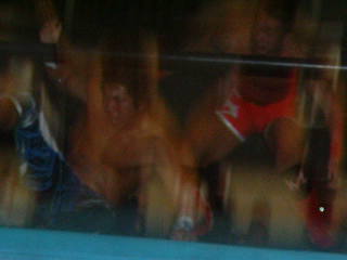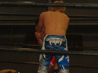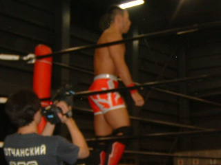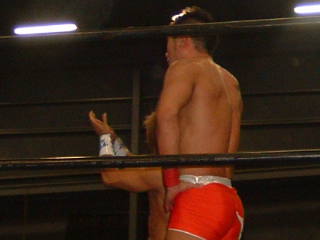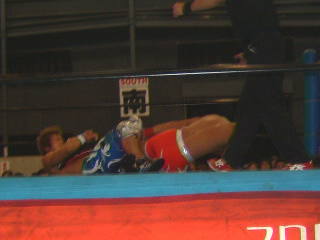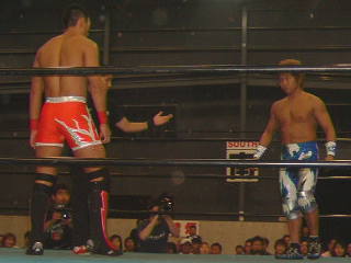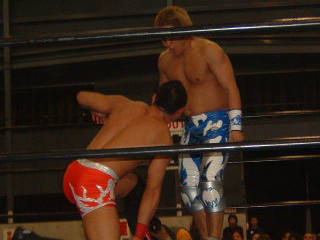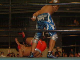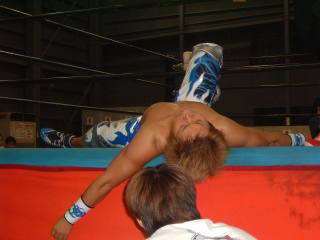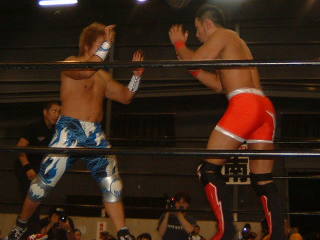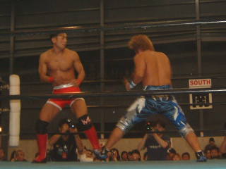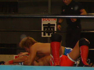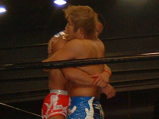 ★背景に色々なものを感じながらのこの試合は素晴らしきバチバチでした。日高選手がバトのリングに上がるってだけで,もうたまらない感じがしました。ゴングが鳴るや原選手が飛び膝蹴りで奇襲。これでいきなり火が付いたか?日高選手も掌底で応戦。掌底合戦で激しくシバキ合う両選手。日高選手の野良犬フックも火を吹きました。そして,強烈な日高選手のソバットが原選手の胃袋を突き上げました。そこからグランドでの攻防。お互いなかなかいいポジションは取らせない。原選手の食らい付き方がもの凄い。しかし,段々とキャリアの差からか日高選手がリードしていく。立っても強烈なバックドロップが決まる。が,原選手も気持ちで体を引っ張りジャーマンを炸裂させる。ダウンする日高選手が立ちあがるとニ発目のジャーマン!!美しいブリッジに強烈なクラッチ。さしもの日高選手もKO寸前。なんとか起きあがる日高選手をキャリアの壁を越えた原選手の猛攻が襲う。キックの連打で日高選手がダウン。これで決まったか?と思わせる勢いでした。しかし,ここで負けるわけにはいかないとばかりに険しい表情で立ちあがる日高選手。原選手のミドルを捕獲するとイグチボムが炸裂!!そしてグランドでタップ寸前に追い込まれる原選手。見る者の心を打つ"原 学"という青年の表情に会場の熱い声援が降り注がれる。素晴らしい根性でピンチを脱するや飛び付き逆十字からの三角絞めやおんぶスリーパーで食らいつく原選手。原選手...いつの間にこんなに成長を。見る度に成長は感じるけど,見る者の心に響く戦い。プロレスの間も素晴らしい...原選手の全てを出し尽くす気持ち良さ...この若者の未来に期待せずにはいられない。対戦相手の日高選手もそんな気持ちではなかったのだろうか。試合はもうどっちが勝ってもおかしく無い名勝負。館内のボルテージは最高潮に。しかしヒダキャッチが炸裂すると一気に終焉へ。最後は背骨が真っ二つになりそうな強烈な逆片エビ固めで原選手が無念のタップ。世代を超えたバチバチは会場になんとも言えない感動の空気を漂わせた。試合後健闘を称え合う両者。原選手は感極まり涙。出てった先輩と,自分達のリングを守ってきた後輩。二人の再会はリング上の空間で心地良い響き方をした。その響きは客席に伝達し会場が感動で響きあった。