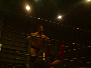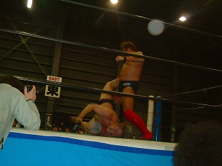 池田選手とのダイビング・大ちゃんボンバー+ジャーマンの連携でダウンを奪う。