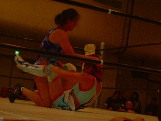 大きく手を広げたエスイ選手が客席に向ってくるや,隣の盟友とき兄さんの前で止まる...「とっ,とき兄さんが危ない!!」