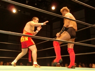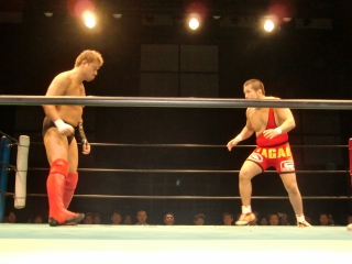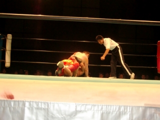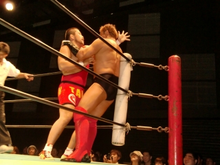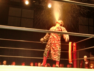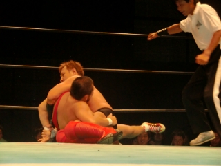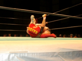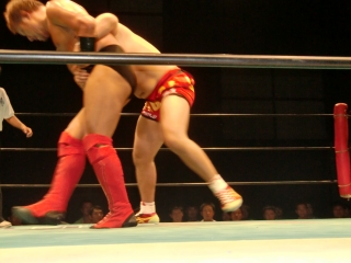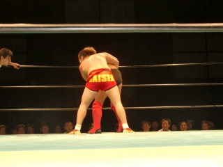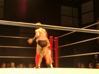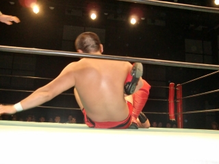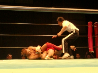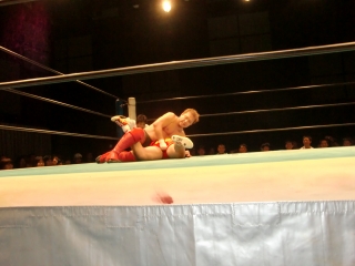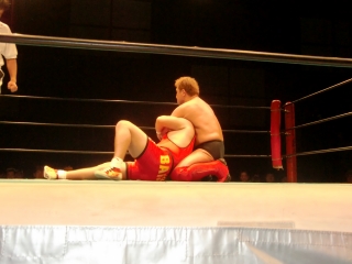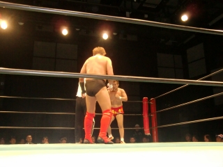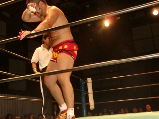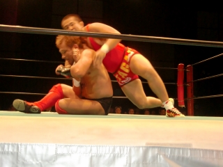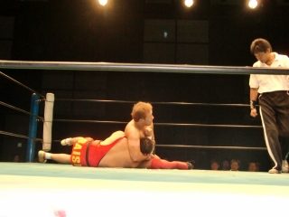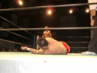 鼻から大流血の焙煎選手だったが,根性で立ち上がるが,待ってたのは大ちゃんボンバー。
