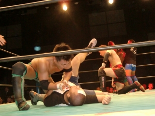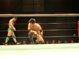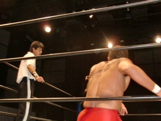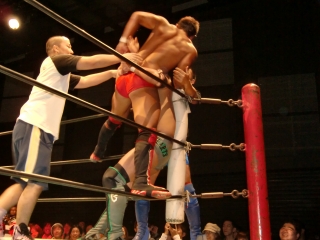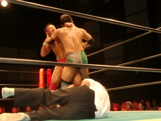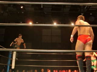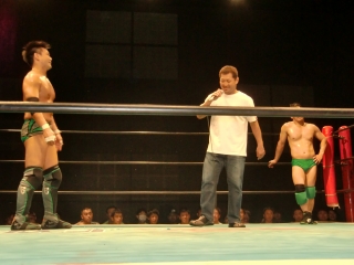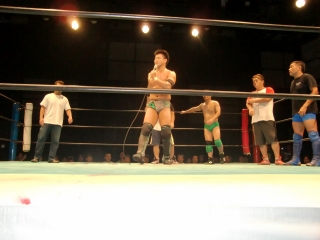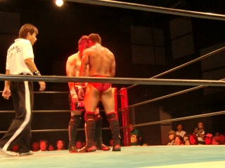 ★試合後はKOされたSEIKEN選手に対し,納得いかないタッグパートナーのスルガ選手が詰め寄り小突く。