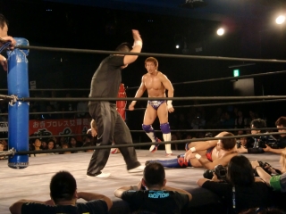最後は稔選手の蹴りで崩してからの,ミノルスペシャルの前に山本選手が無念の涙を飲んだ。