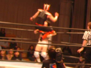 ★到着した俺の目には第1試合が飛び込んで来た。もう試合が始まっている...そりゃそうだ。若作りvsDDTのなかなか興味のある対決。本物の若作りは久しぶりだなあ。試合はNGB特有の熱い試合になりました。DDT勢は立体攻撃を連発。技から重さは感じられないけど美しさと会場女性人気は抜群でした。キックを両選手多様するも当てにいってないのか?当たりは浅いが音は凄いようなキックが連発でした...○__(ー。ー)ハアッ。でもまあ技が美しいからいいのかな?一方若作りは魂で戦う男らしいファイトスタイル!!ガンガンふり抜く打撃に見てる方まで熱くなってくるぜ。それと変形摩周が凄かった。摩周の下の選手が残る選手にパイルドライバーを...凄かったなあ。試合はそんな両極端な両チームが化学変化を起こし予想以上のスイング感。一進一退の攻防から最後は分断に成功したDDT勢。HERO!選手の450°がズバリと決まり試合が決しました。途中からだけど面白い試合でした。ただ大好きな井上選手の出番が俺の遅刻のせいであまり見れなかったのが残念でした...リーダー!!って応援したかったぜ。