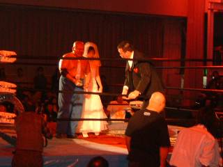 試合後はバカガイジンズも小林選手を祝福。そしてセレモニーへ!!小林選手の呼び込みでスタンド側から新婦の"アブドーラ小林ちあき"さんがテイオー選手にエスコートされ入場。綺麗なウェディングドレス姿に注がれる祝福の嵐。ハイヒールで画鋲と血の海に敷かれたバージンいやバカチンロードを渡り新郎のもとへ。幸せな二人が揃う。新郎新婦プロフィール紹介。藤田選手・本間選手・葛西選手の祝電(ナガサキ選手・ポーゴ選手からも)が読まれると小鹿社長が挨拶。本当に嬉しそうな表情の小鹿社長でした。その後新婦さんが小林選手に手紙を読み最後は選手達と新郎新婦の記念撮影が行われ会は終了しました。そうそうセレモニーの最中に「早くメインやれよ!!」お嫁さんが手紙を読んでるのにに「ハイハイハイ...」と野次...野次じゃねえな奇声を発してる女がいました。場の空気も読めずに意味不明の奇声を発し会場いやセレモニーにちゃちゃをさした...シャブ中か?"他人様の恋路を邪魔する奴は馬に蹴られて死んでしまえ!!そんな糞もいましたがほとんどの人が祝福してたと思います。小林選手には披露宴というより疲労宴だったかなあ。小林選手おめでとうございます!!末永くお幸せに☆