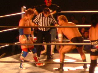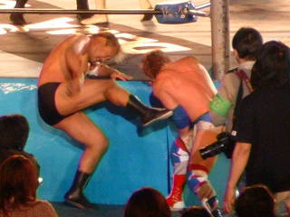 ★"大日本プロレスvs格闘探偵団バトラーツ"...10周年のヒトコマに相応しいカードでした。先発はウィンガー選手とジュンジ選手。ウィンガー選手がなかなかのテクニシャンぶりを発揮。そして,石川選手とテイオー選手が顔合わせ。二人の間の空気がピーンと張り詰め10周年の御祭りムードを切り裂く。石川選手が強烈な"張り手"を食らわせば。テイオー選手も強烈な"エルボー"で応戦する。なんだか凄まじい立ちあがりだ。エプロンのテイオー選手に石川選手が放った"顔面斬り"でテイオー選手が場外へ墜落。そのまま場外戦でテイオー選手が椅子に突っ込み大流血。そこからは"テイオーvs石川"という凄まじい殺気を放つ絡みが中心となっていった。それはリング内外だろうが,試合の権利があろうがなかろうがであった。まるでバチバチだ。リングでウィンガー選手とジュンジ選手が戦っていても場外の二人に目が行ってしまった。