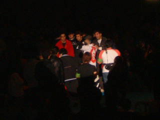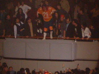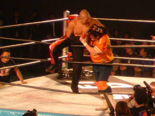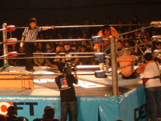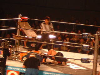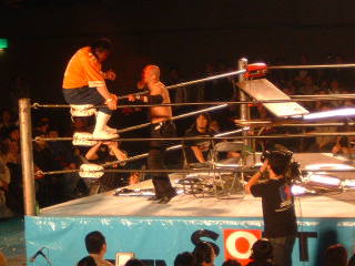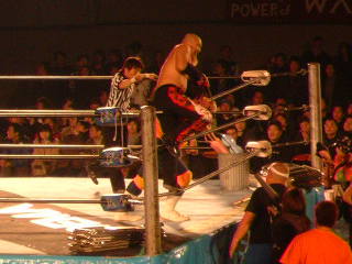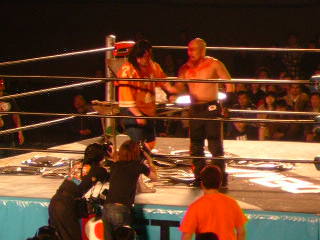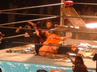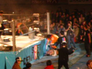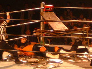 ★いやあイイ試合だった。俺的に沼澤選手の今年の試合の中で一番良かったかな。まずは金村選手が入場。ステージ上で仁王立ちだ。そんで沼澤選手入場。Yシャツにネクタイでパンキッシュな感じだ。人ごみを掻き分けステージへ向かう。ステージに両選手が揃うとカンウントダウン開始。5,4,3,2,1!!試合開始。まずは突進してくる沼澤選手を金村選手が"カウンターのスロイダー"でぶん投げる。負けじと沼澤選手も"コルバタ"で投げ返しステージ上を征す。リング上は金バケツに凶器がわんさか入っている。それに椅子も沢山ある。沼澤選手が"糸ノコ"で金村選手の額をギコギコ切り刻む。金村選手も"パソコンのキーボード"で殴ったりして主導権を握る。戦場が場外へ移ると沼澤選手をテーブルにガムテープで固定する金村選手。すると"2階コール"が起こる。そして金村選手がテーブルと沼澤選手を打ち砕く2階からの"ダイビング・ボディープレス"を敢行。その後も蛍光灯等を使い責め続ける金村選手。