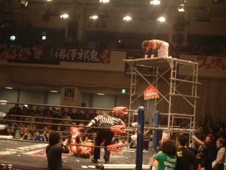 この日のデスマッチは「廣島大治組プレゼンツ高所作業につき立体足場建築現場デスマッチ」。