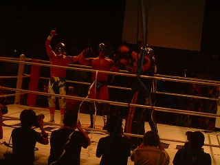 最後はシンガポールスティックの一撃からのマッチョ☆ボトムでシュウ選手を沈めました。