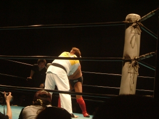 蘇生した池田選手はカウンターの大ちゃんボンバーで石川(修)選手の巨体をふっとばす。