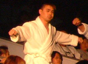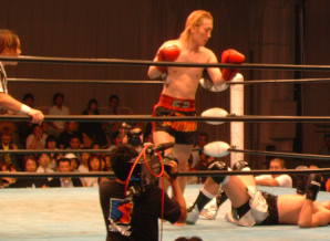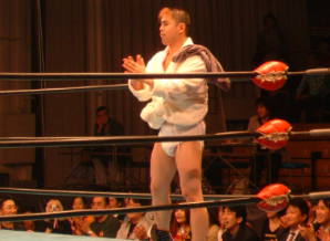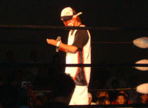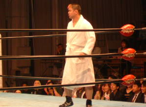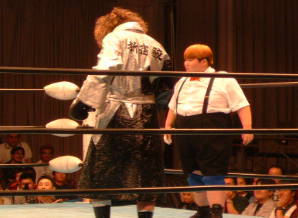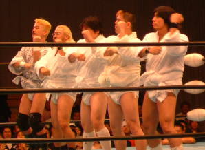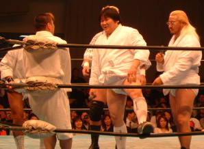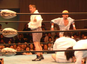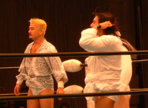 ★この日で最後?の白い天使達が登場。会場が一つになる。今回のネタはTAKA選手をいじるもの。バスローブの下にトランクスを履いたTAKA選手にブリーフになれと...で結局トランクスの下にブリーフ履いてました。GEN選手はまたまたBVD。で,金ちゃんの怒りをかう。理由は昔,新日本のスポンサーになってたから。結構笑ったなあ。