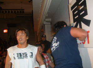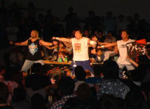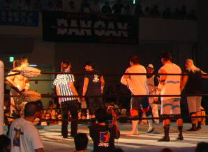 ★アパッチ軍vsZERO-ONEの全面戦争。ZERO-ONEからの抗争が一気に爆発。ただ試合内容はストリートファイトの為把握できず。よって各選手に対する感想でも書こう。金ちゃんはインディー統一の野望を達成すべく形振りかまわぬファイト。要所要所でハードヒッティングな攻撃をしかけてました。哲っちゃん相変わらず小気味のイイファイトとトークで会場を盛り上げる。流石だ。雁ちゃんも雁州殺法や得意のダーティーファイトでイイ感じだ。この人は何気に凄いテクニシャンだなあ...素晴らしいです。一方ZERO-ONE勢は,田中選手は流石超一流って感じです。存在感が重い。ファイトはあまり見れなかったけど,とにかく存在感は抜群だ。保坂選手は風貌と違いなかなかのテクニシャンぶりを発揮。空中殺法もズバット極めてました。そして,佐々木選手。う~ん実に素晴らしい若者だ。技の一発一発に魂が感じられました。特にスピアーは抜群でした。体も出来あがってるしかっこよかったです。試合は,終盤佐々木が粘るも黒田選手のラリアットでピン。熱戦に終止符がうたれました。
