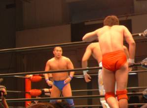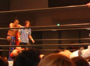 ★オープニングマッチは若手によるタッグマッチ。第1試合から熱い試合となった。K-DOJOの2選手が,やはり手があっているようで試合を引っ張って行く。下田選手はこの中では一回り体がデカイ。よって攻撃もハードだった。藤田選手への蹴撃は凄かった。サッカーボールキックやハイキック何度もくらう藤田選手...しかしやられなかった。藤田選手はセンスが良くハートも良さそうなのだが,どっかで技を綺麗に見せようってのが感じられるのでもったいないなあ。もっとがむしゃらに感情ムキだしの彼が見てみたい。しかしドロップキックなどでそのセンスの良さを垣間見せていた。最後はK-DOJO同士の何度も戦ってできたクオリティーの高い攻防からサンボ選手が旭選手のお株を奪うレッグスプレッドでタップを奪った。第1試合らしく活きのイイ試合でした。