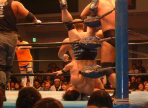 ★熱い試合だった。血が熱くなった。素晴らしかった。そんな試合でした。ただストリートファイトなので試合内容が把握できませんでした。だって何処見てればいいのさ!なので各選手の感想をどうぞ。まずアパッチ軍。金村選手は志が高いのをひしひし感じさせるファイトでした。爆YAMAやヒューマントーチまで出して戦ってました。黒田選手はう~ん最高!!しかし高岩選手のパイプ椅子サンドイッチ式ラリアットからのデスバレーで退場に...残念でも最高!!!雁之助選手もイイ動きしてました。雁之助クラッチはいつ見ても至高の技ですなあ。TAKA選手は中盤からZERO-ONE軍に捕まり孤軍奮闘。数々の拷問攻撃をくらってました。大流血してしまうもスーパーK連発,ジャストフェースロックなどで"あわや"も演出してみせました。しかし良く耐えたなあ。思わず応援してしまった。一方ZERO-ONE軍。大谷選手はヒールを楽しんでいました。素晴らしいレスラーです。田中選手はもう存在自体が凄いです。技も迫力あるしね。高岩選手&佐々木選手も目立ちはしないものの素晴らしい肉体とハードヒッティングな攻撃を見せてくれました。最後は金村選手が大谷選手のキングコブラホールドでタップを奪われました。とにかく熱い試合だった。汚い野次が嫌だったけど...いくら敵とはいえ「死ね」とか「うざい」とか...言ってる奴がうざいなあ。リアルレスラーを舐めたらいけませんリスペクトしましょう。