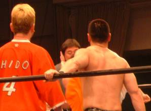 ★試合は終わるも戦いは終わらずでした。試合後リング上を占拠するZERO-ONE軍。オラがいろいろウォッチングしてると後ろから非道選手にどけっと...そのまま乱闘に。アパッチ軍が逆にリングを占拠。ZERO-ONEの練習生をリンチ。すると救出に耕平選手や山笠選手が乱入。そして金村選手の呼び込みで総大将橋本選手登場!!いろいろすったもんだして最後はアパッチ軍の攻撃を受けまくって退場...今後の展開も目が離せないぜ!!