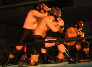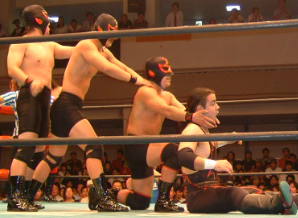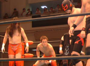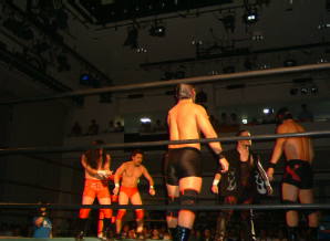 ★結構イイ試合だった。X'sは2号&3号が素晴らしい。かなり高いプロレス技術を披露していました。ミスターは技自体は迫力があるもレスリング自体は2号&3号に劣るかなあ。合体技もバシバシ決めてKの理念とはちょこっとズレていたが面白かったからいいかな。...いいとも?旭選手はだんだん良くなりますね~。やはり外での試合数が結構あるせいだろうか。外でもまれるとやっぱいいよなあ。技への気持ちの込め方が実に良かったです。マイク選手はこの日も精彩をを欠いてました。う~ん。前はもっと良かったのになあ。はっきり行って全く駄目でした。あまり登場しなかったので試合を壊す事はなかったけど。ストーム選手も流石東北の夏を乗り越えただけにレスリングの幅が広がってみえました。終始自信と余裕が感じられました。え~この試合も場外戦に巻き込まれまくったのでフィニッシュを見れず。またセコンドのせいで結構損しました。まあこの日はずうっと場外戦が俺のいた場所で行われていたので大変でした。本当ひやひやっすわ。