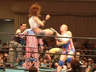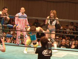 バンビ選手は初目撃。「昭和」子の時は感じられなかった大きさにビックリ。かなりの長身だったんですね。長身から放たれたミサイルキックは素晴らしい美しさと迫力でした。人気も抜群だし,なにより可愛いのでいいですね。中川選手は気合い満点でした。気の強さを感じさせてましたね。小幡選手も初目撃。いや~イイ選手ですね。頭かなんかに爆弾持ってるんですかね?しかし,とにかくバネが素晴らしい。体もカッコイイし,顔もカッコイイ。人気が出そうですね。で,何よりビックリしたのは,垂直跳びドロップキック。普通の感じじゃないんです。なんつうかビックリでした。もう1度観ないと説明できないです。しかし凄い一発だったなあ。しかし,会場の反応はイマイチ...う~ん素晴らしいムーブだったんだけどなあ。どぼちて?上越選手は...正直印象に残ってません。なんか突進してたのは見ましたが。すいません。