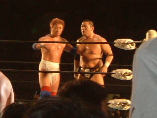 ★入場した勤皇党が,コーナーポストを占領する様子はカッコ良かったなあ。一方海援隊は一人づつ入場。試合は序盤・中盤は海援隊が懐かしのムーブで沸かせ,勤皇党が攻めこまれる場面が見られた。終盤になると勤皇党が現行ユニットとしての強さを見せました。TAKA選手にターゲットを絞り,最後もKAZMA選手のAXボンバーでピンでした。現行ユニットの勝利で終わったが,是非また違ったシュチュエーションや会場で観たいですね。