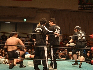 ★試合の主導権はほぼ勤王党でしたが,大石&旭組を機動力と連携で終盤には大反撃。予想以上の熱戦に会場は凄まじい熱気...観衆は少なくとも熱気は凄かった。最後はKAZMA選手のAXボンバー狙いを,大石選手がカウンターで丸め込み勝利しました。試合後は疲れて立つのもやっとの勝者。敗者は余力があった...しかし,勝ちは勝ち。プロレスにおける丸め込みもまた芸術。勤王党ファンの僕ですが,素直に面白い試合だったので大石&旭組の勝利を祝福しました。が,強くて上手くてカッコいいのは勤王党です!!