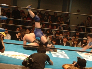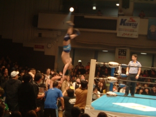 円華選手の宇宙人プランチャにTAKA選手のラ・ケブラーダ。