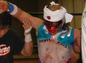 ★優勝候補同士の公式戦。リーグ戦の天王山でした。こまち選手が故障中でFECが今シリーズから超ルード化しているという新幹線コンビには全く不利な試合です。新幹線も大好きだけど,FECがもっと好きなのでFECを応援しました。序盤から凶悪な攻撃をしかけるFEC。新幹線は早くも防戦一方。隙を見て反撃するもどれも単発に。中盤にさしかかるころから新幹線の反撃。試合のテンポもアップ。はやて選手の幻。こまち選手の横回転式アームホイップなど素晴らしい立体攻撃で形勢逆転。勢いに乗る新幹線。はやて選手がトぺ・コンヒーローで飛べばこまち選手も...これが悪夢の始まりだった。こまち選手が放った矢のようなトぺ.スイシーダを折原選手が椅子で迎撃。これが強烈すぎ。こまち選手は首からもろに突っ込みピクリとも動けなくなり若手に担がれ退場。若手やスタッフの慌てぶりから相当ヤバイんだなと思いました。後に分かったんですが,こまち選手の首が試合前から相当ヤバかったみたいです。よく頑張ったなあ。さて,そのころリング上では...はやて選手の公開処刑が。こまち選手が完全にいなくなり2対1のハンディ戦に。小さな新幹線一両であまりにも強いFECと戦うはめに。マスクは破かれ流血。FECの二人がかりの攻撃が続く。折原選手のスパイダー→ムーンサルト,みちドラⅡもクリアーするはやて選手。いったいどこにそんな力があるんだ。もう感動だあ!!東郷選手のTシャツ着てるのぎ途中からはやて選手を応援してしまった。頑張れはやて選手!!その後も数々の拷問をクリアーするはやて選手。そして東郷選手がトップロープに。セントーンか終わったな。と皆が思った時はやて選手の反撃だあッ!!東郷選手を飛べなくして折原選手も場外にふっとばす!!また攻撃をしかけられたりしたが粘るはやて選手にプロレスの神様が微笑んだ。フィニッシュは東郷選手の余裕の隙をつく超難解な丸め込み"臨時急停車式エビ固め"奇跡の勝利!!試合後も一人では歩けないほどのダメージなのに...よく勝ったなあ。すごいぞはやて選手。マジで感動しました。たった一人でFECに勝つなんて凄いよ!!とにかく感動的な試合になりました。しかし,東郷選手の受けはやっぱ凄いなあ。ただのアームホイップが凄い技にみえちゃうもんなあ。アトミコも何度観ても凄い!!入場時の座頭一もかっこいい。でもこの日の主役ははやて選手でした。いや~いがったいがった。