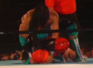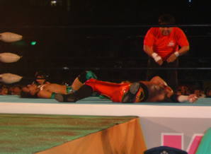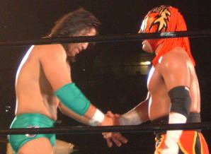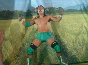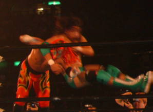 ★第1試合は同期入門対決。しかし,みちのくvs大阪という看板背負った勝負という難しいシュチィエーション。だが,そんな物を感じない男と男の熱いシングルマッチとなりました。まずは御互いの成長を感じ取るかのようなロックアップ,ヘッドロックとオーソドックスなレスリング。中盤になると試合が激しさを増して行く。意地のぶつかり合い。どっちも引かないエルボー合戦。まずは湯浅選手がペースを握る。パワースラム,串刺しラリアット,コーナーエルボー,テキサスクローバーと怒涛の攻めで追い込む。しかし,デメキン選手の一瞬の隙を突くスタナーで逆転。トぺ・スイシーダ、急角度のバックドロップ2連発でカウント2.99!!しかしラリアートで今度は湯浅選手が反撃。ラリアットの相打ちがあるものの湯浅選手がスパートを掛ける。ダイビング・ブルドッキング,超急角度ジャーマン,北斗原爆で攻めたてるも3カウントは奪えない。必殺の鳴門海峡をかわされるとジャーマン,シャイニング・ウィザードを挟んでフィニッシュへ。最後は美しすぎるフィッシャーマンズ・スプラッシュでピン。一進一退意地と意地のぶつかり合いに第1試合から興奮しました。湯浅選手も最近メキメキ成長していましたが,相手は普段大阪では別の顔で中心選手。その差が勝敗に出てしまったのか?いや~実に若若しい熱い試合でした。すんごいイイ試合でした。ちょこっと湯浅選手が負けて悔しかったけど。