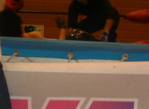 ★熱戦続くこの日の興行。メインもメインの名に恥じない素晴らしい試合でした。まずはスカボンの入場。???日高選手がいない?そして我らがFEC入場!!俺はこの日の為に応援ボードを作って来ました。サイプレスのイントロからサスケ選手のテーマへ入る合体テーマで入場。しかしFECの後ろには日高選手が。日高選手の急襲から試合は荒れ模様のスタートとなった。先手を奪ったと思われたスカボンだったがペースは握れず序盤から一進一退の攻防となった。マッチョ選手はベルトを帯に変えて?の戦い。敵だけどスカボン入ってからのマッチョ選手は実に素晴らしい。元々体もデカク身体能力も高いのがスカボンでのポジションで一気に爆発って感じでしょうか。とにかく自信を持って戦っているって感じでした。藤田選手は憎憎しい戦いっぷり。小悪党的な戦いっぷりでペースを絶対に握らせませんでした。サスケ選手はやっぱサスケ選手。いつ見てもサスケ選手です。相変らずアトミコ失敗してました。でも熱く熱く戦ってました。東北の英雄はやっぱいつ見ても東北の英雄だな...カッコイイぜ!!守部選手はまたも成長してました。本当見る度に成長しますねえ。スポンジのような吸収力ですね。モヒカーノ2連発は凄くカッコ良かったです。なによりの表情が素晴らしいです。試合は一進一退の攻防がスイングしまくりました。藤田選手のダイビング・ボディープレスでサスケ選手が場外に。マッチョ選手のマッチョボトムで守部選手が追い込まれるも凄い粘りで逆転。コーナーにマッチョ選手を乗せると...!!ああああ。「ここしかねえだろッ!!」とアニメのキャラのような言葉を吐く俺。そうスパイダーの体勢。この日一番のヒートだったなあ。守部選手は腕に力を込めながら"スパイダー"と絶叫。みんな絶叫!!そしてスパイダーが炸裂...折原選手の突然の失踪。メインでの試合の連続。FECを守る重圧。期待と不安が沢山あったであろう今シリーズの思いをのせてスパイダーが炸裂した。ダメージからかマッチョ選手は場外へエスケープ。リング上はサスケvs藤田と因縁の顔合わせ(この時点でも守部選手はコーナーからやっと降りている状況。凄いダメージのようでした。)。サスケ選手が主王権を握るも。サスケ選手がコーナーに昇るやセコンドの日高選手が椅子で襲撃、すると藤田選手が雪崩式フランケンでぶん投げる。そのまま場外にエスケープしたサスケ選手をマッチョ選手が捕獲。リング上では大ダメージの守部選手が藤田選手に攻めたてられました。粘りまくる守部選手でしたが,藤田選手のリバースバイパーホールドがガッチリ極まる。ギブアップしない守部選手に技の極まり具合を見てレフェーが試合をストップさせ終了しました。熱い試合でした。凄く面白かったです。フィニッシュも納得のレフェリーストップでした。最後までタップしなかった守部選手にFECの意地を見せられました。試合後はマイク合戦に...観戦後記に続く。