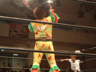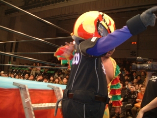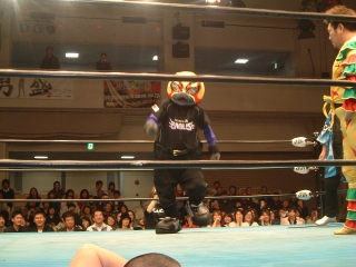 ★なんとカラスコ君登場のサプライズ!!初めて生カラスコを観ましたが,噂通り動けてましたね。信じられません。試合中も色々とおかしなしぐさで笑わせてくれました。おかげで試合は集中できなかったけど。マンゴー選手の圧勝でしたが,主役はカラスコ君になっちゃいましたね。