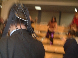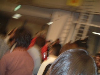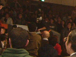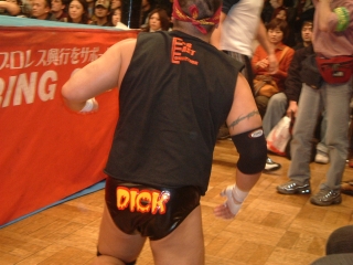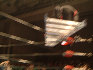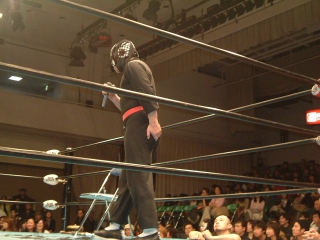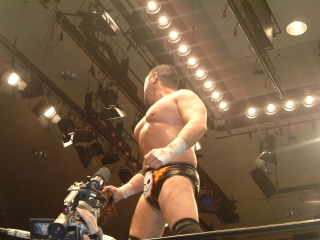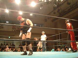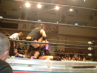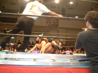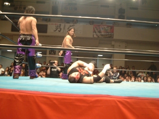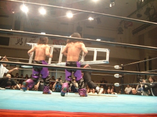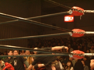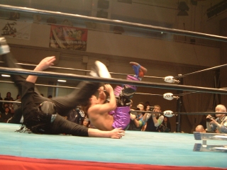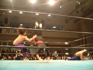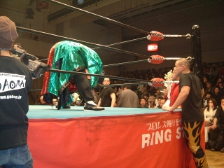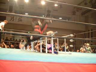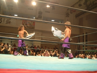 肝心の試合ですが,佐藤兄弟のコールが終わり"さあ!紙テ投げるぞ"と思ったら...佐藤兄弟が奇襲をかけ試合開始。...せっかくTOKI兄さんの愛情のこもった紙テ弁当が!!これは試合でお仕置きしていただかねば...と思いきや序盤は佐藤兄弟が数的有利を利用してリード。東郷選手は早くも流血に。サスケ選手は南のスタンドで自転車を持ち出すもセコンドのまぐ狼選手にやられたり,階段を自転車で駆け下り・ずっこけたり...まさにサスケワールド全開。そんな中リング上では東郷選手が佐藤兄弟に二人がかりで蹴られまくり...オー!!笑って怒って大変です。僕の体を背にして休憩を取ったサスケ選手はなんとか復活...サスケ選手を休めさせられて幸せでした(涙)。しかし,佐藤兄弟の連携になかなか形成を逆転させれません。なんとか逆転に成功させるサスケ選手でしたが,ラダーに佐藤どっちかの選手を乗せアトミコを...やはりかわされ大ダメージ。さらにラダーを首にかけられコーナーに詰めての椅子ゴンゴン。さらにラダーで攻撃を狙う佐藤兄弟。しかし,サスケ選手は佐藤兄弟の持ち込んだ凶器の棒を見事に使いマトリスク的キックで迎撃...すげええ!!さらに息を吹き返した東郷選手が佐藤兄弟それぞれにぺティグリーを炸裂させ,二人まとめてのクロスフェイスで締め上げました...うおおおおお!!カッコイイ!!サスケ&東郷組に押せ押せムードが漂って来ましたが,そこはサスケ選手。コーナーのトップロープにラダーを乗せアトミコ発射...やはりかわされました(つうかコーナーから飛んでも高さ一緒なんだけど...やはりサスケ選手の考えてる事は凄すぎる)。ここで戦場は場外へ。セコンドのまぐ狼選手がトルニージョで飛んだりしてると...サスケ選手がなんとスライダー(鋼製伸縮梯子...僕らの仕事ではスライダーと呼ばれてます)を持ち込み登場!!さらにそれをバルコニーにかけ昇っていきます(何度か失敗するもめげないサスケ選手)。そして真ん中を過ぎたあたりで佐藤兄弟が急襲...サスケ選手と共にスライダーが倒れる...事故です!!我社の部長は同じような状況で腰の骨を折りました(もちろん事故で労災です)。ありえないです。危ないです。サスケ選手意味不明です。ちなみにこの時デジカメのフラッシュの設定が興奮しすぎて変わっていたのに気付かず,写真が綺麗に撮れませんでした(涙)。サスケ選手が魅せたら?東郷選手も黙っていません。なんと場外へのシルバーブレット敢行!!うおおおおお!!これもありえねえ!!凄い凄い凄い!!そんなありえない攻防が続きましたが,最後は復活したサスケ選手がセグウェイ一発でピン!!あんな事故ばりの事があったのに動けるなんて...凄い!!本当プロレスラーは凄い!!やはり東郷&サスケ組はみちプロ史上最強のコンビですね。もう強いし凄い!!関東シリーズであれだけ毒を放った佐藤兄弟でしたが,今回は貫禄負けでしたね。今後も大きな武器になりそうな毒舌もおとなしめだったし,それを出させなかったサスケ&東郷組の威圧感ってのも相当あるんでしょうね。本当リングの上は未知の世界ですね。