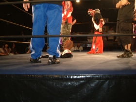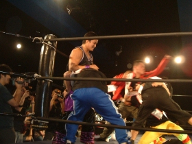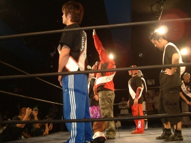 ★試合に先立ち全選手入場式が行われました。代表して前東北ジュニア王者南野選手が選手宣誓。そして,華井選手が抜けた事でロス・サルセロス・ハポネセスの解散を宣言...リングにいなかった福田選手がちと可愛そうかもね。すると華井選手が南野選手と乱闘...それが飛び火し乱闘で開会式は終りました...が,ちとグダグダな感じでしたが。気を取り直して試合へと突入です。