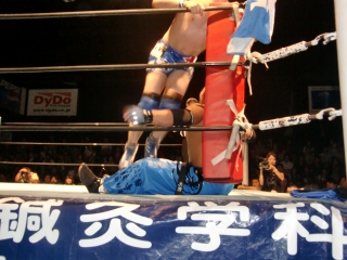 良い感じで試合が進んでいたが,コーナーに上ったTAKA選手がラムジャムを狙い阻止される...