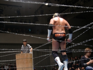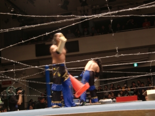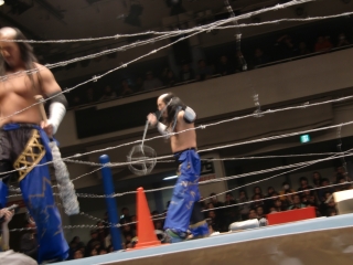 しかし,今回は大仁田選手やサスケ選手が経験しているノーロープ有刺鉄線デスマッチだから分が悪い。