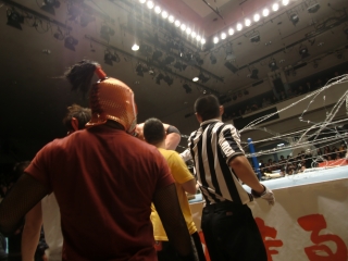 大仁田選手が待つリングサイドに渋々歩を進めるマホッチ。
