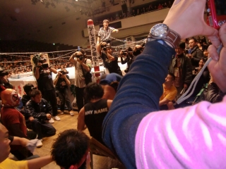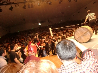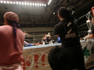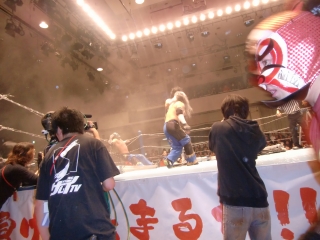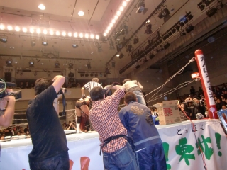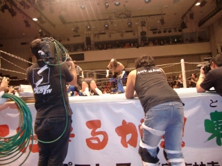南側リングサイドで,佐藤兄弟のどちらかに水を噴射した大仁田選手は,満足そうに今度は東側にやって来た。