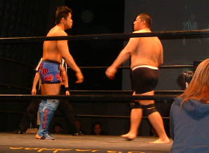 ★昨日の流れから柴田選手がバギーズ側に。試合前はこれぞU-FILEっていう試合をしようと誓ってました。なので入場しても柴田選手はバギーパンツを履いてませんでした。試合は中盤柴田選手が捕まりました。それをかばうAmerica選手...愛?途中柴田選手が退場してしまい2対3のハンデ戦に。そうこうしているとバギーズのテーマ曲が流れ柴田選手がバニーパンツ姿で入場。で,試合の途中なのにマイクアピール...おほほ。終盤息を吹き返したバギーズ。最後は柴田選手がプランチャのような感じでリング内の田村選手に超危なっかしいボディープレスでピン。バギーズに新メンバー柴田正人改めSHIBATANK?が誕生しました。しかし柴田選手の攻撃&受け身は危なっかしくて大変です。なかなか面白い試合でした。