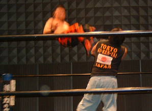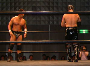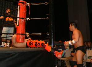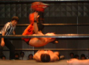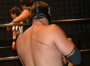 ★休憩明けのセミはまたまた面白かった。今日は面白い試合が続くなあ。この試合は熱かったです。PWCでは珍しく黒田選手が絶対的なベビーフェースにはならなかったのも不思議だったな。おかげでおちゃらけ少な目の熱い試合でした。菊澤選手はあまり目立ちはしませんでしたが,随所でイイ仕事してました。目立たなくても素晴らしいテクニックでバイプレイヤーしてました。また受けが最高でしたなあ。はあっ。菊澤選手として見れる団体も少ないからなあ...PWCが無くなるの勿体無いなあ。黒田選手は人気抜群も絶対的じゃないのが面白かったかな。体が他の選手より大きいのにスピードで見劣りしないのは流石。もう一丁エルボー,哲ちゃんカッターも見事に決めてました。守部選手はFECと離れクーガー選手とタッグも己のスタイルで戦ってました。急所蹴りの時のフォームや表情はベテランルードばりでした。ミサイルキックやモヒカーノも良かったなあ。鬼退治もうっかり初めて生で見ました。コスチュームも赤になりカッコ良かったです。かなり守部選手いいです。クーガー選手...カッコイイ!!声がまたカッコイイんですよ。Uターン!!の声は最高です。技も最高でした。Uターン,ギロチンフルコース,トペコン立体攻撃最高でした。でも一番カッコ良かったのはスリーパーしてる時の姿。いやあ惚れ惚れしました。試合は両チーム一進一退の熱い攻防が続きました。そんな中黒田選手が守部選手とのバックの取り合いから急所蹴りで優勢に。そしてシャイニング・ウィザード一閃。が,ここはクーガー選手がカット。しかし,ここで足踏み付きのラリアットが炸裂。普通は決まりな状況。必至で応援するFECファン。その時守部選手の目が上を!!ロープを掴みなんとかクリアー。しかし粘りもここまで。とどめのラリアットでピンフォールを奪われました...あがらなかったけど肩をあげようとしていました。キャリアで劣る守部選手の驚異的な粘りがベテラン勢に火をつけ凄くイイ試合になりました。