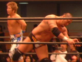 ★超期待のタッグマッチ。これまた予想以上の面白さでした。浪口選手はやはりというか,この中に入るとレベルの差が浮きぼりに。そりゃあそうだけど...せっかくのスイング感なんかをぶち壊してました。試合によっては,きっと頑張るだけでは駄目なんですよね。頑張っても試合のテンポを落としては意味がない。まあマッチメークに入れたのが失敗ですな。クレイジー選手は,やっぱ凄いっす。動きが凄い。"ローリング・ロメロスペシャル"をあそこまでガッチリ極めるってのも凄い。日高選手との絡みでは,熟成された攻防を。東郷選手との絡みでは,衝撃的な攻防を。流石というような動きを連発してました。一方東郷&日高組。久々のタッグながら素晴らしいチームワーク。「大将」と呼ぶ日高選手(涙)。日高選手の"足四の字固め"に東郷選手が"ハイフライバム"で加勢するとこなんざ,当時のチームワークを彷彿させました。日高選手はクレイジー選手とハイレベルな攻防を繰り広げました。裏の読み合いからの"スウィングDDT"。"回転エビ固め"からの"低空ドロップキック"の読み合い。流石チャンピオンですね貫禄もありました。東郷選手は...感動的な上手さです。クレイジー選手とのグランド合戦。受けのポジション。相手を生かす動き。いきなり間合いゼロからの"スーパーK"...転んでもただでは起きませんな。この試合では"日高vsクレイジー"の攻防が目立ってましたが,そこを浮きぼりにした東郷選手のバイプレイヤーとしての凄まじい能力。とにかく目立つ訳ではないんだけど,細かなテクニックに目が釘付けでした。凄い技を繰り出すクレイジー選手に驚けば楽しい観戦ですむのだろうけど...どうしても,そこにある東郷選手の動きに感動してしまいます。こんな見方良くないのかもしれないけど,やっぱ世界の東郷選手の技術は見ていて感動します。本当凄い選手です。試合は終盤浪口選手が捕まりローンバトル。日高選手の"ショーンキャプチャー"が極まるが,なんとかクレイジー選手がカット。しかし,最後は東郷選手の強烈な"ラリアット"に事実上KOされる浪口選手。とどめの"ぺティグリー"からの"ダイビング・セントーン"が美しく決まり東郷&日高組がキッチリ勝利しました。試合後は東郷&日高組の勝利ポーズ(涙)...東郷&日高組を再び見れて嬉しかったなあ。やっぱ東郷&日高組は最高のチームです!!満足満足超満足。