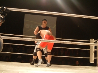 ★キャリアの差と,ルード...松本選手には試練のデビュー戦となったが,内容は素晴らしかった。まずはロックアップで組み合う両者。流石にウラノ選手がロープに押し込む。そしてクリーンブレークに「おおお」と唸る場内。続いて松本選手がロープに押し込みエルボーを食らわしブレーク。するとウラノ選手はレフェリーに反則とクレーム。本当食えないなあ。この食えなさが,いかに新人の松本選手には脅威だったことか。続いて腕の取り合い。これはウラノ選手が制する。さらにグランドに引きずり込み袈裟固めから強烈なネックロックで締め上げる。この強烈な攻撃をなんとか逃れる松本選手。さらに腕を絞り上げコーナーで顔面蹴り。さらにチョークスリーパー,首絞めと反則攻撃。続けてサッカーボールキックで魅せる。さらにフロントネックロックやヘッドロックで締め上げ。さらにボディーへの膝蹴りで松本選手を追い込むウラノ選手。が,松本選手も意地を見せる。バックステップキックからニールキックでウラノ選手をダウンさせ。さらにカウンターのスロイダー。そしてノーザンライトスープレックスホールドを決める。しかし3カウントは奪えず。得意の攻撃を受けきられ動揺する松本選手。そこを見逃すウラノ選手ではなかった。強烈なエルボーを食らわし,ヘッドロックで締め上げる。なんとか粘る松本選手でしたが,腰を落とされさらに締め上げられるとタップアウト。ウラノ選手の貫録勝ちとなりました。試合後は握手と見せかけボディースラムを食らわすウラノ選手...本当最期までプロでした。ウラノ選手がまたも高い壁となりました。そこで数々の引き出しを見せ,試合をコントロールした技術は本当に素晴らしい。一方松本選手の奮闘も素晴らしかった。キャリアの差や体格差を考えれば怖かったはず。しかも百戦錬磨のルード相手。それでも果敢に前向きに戦った姿勢に感動しました。そして,柔らかな動きにも注目です。しかも山形県米沢市出身...こりゃあ応援しなきゃね。プロレスの面白さを十分に魅せてくれた両選手ありがとう!!