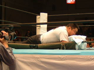★休憩前には腰の怪我で欠場した剛選手が担架に乗せられ登場。そのままリングに上げられ寝たまま欠場を詫びました。そんでターザン山本がブーイングに迎えられ登場。剛選手のショアを促しました。最後は寝たままショア!!連発しました。う~ん流石PB最高馬鹿だな。