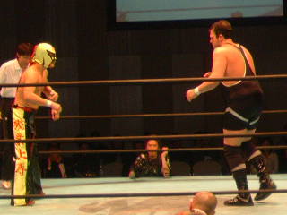 ★CK3(コンラッド・ケネディー3世)選手は外人選手特有のアピールの多い選手でした。試合では"精密機械"とうたわれていながらも...全く精密機械らしさは見られず残念。試合はサラ忍マン選手が終始受けまくりでCK3選手が技をかけまくり。一方的ながらダラダラとした内容でした。最後はCK3選手が得意技"オーナーロール"(Wアームから叩き付ける技)で決めました。プロレスは自分も相手も光らせる事で面白くなるのにね。