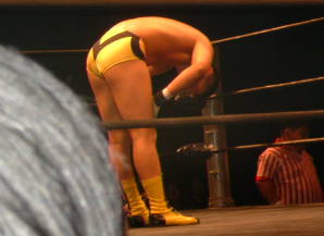 ★新人らしいイイ試合でした。序盤から気迫十分の両者。技の一発一発が見てて気持ちイイ...てゆうか清清しい。やはりキャリアで勝る藤田選手が試合をリード。それに宮本選手が食らいつく。藤田選手のノビのあるドロップキックが何度も炸裂。しかし宮本選手は全て受けきる。終盤は完全な宮本選手ペース。声援も宮本選手が多い。終盤に飛び出したスワンダイブ式ダイビング・ヘッドバットは素晴らし過ぎました。ロープからロープまで飛ぶ跳躍力...凄い。最後は藤田選手の先輩としての意地のチキンウィングアームロックでフィニッシュ。それにしても両選手とも受身が教科書通りではあるがキッチリ取れててビックリ。小さな団体の小さな宝石...2つ見つけた!!やっぱ道場がある団体の選手は受身がしっかりしてて安心できます。とにかくイイ試合でした。
