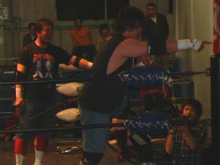 ★実質WMFのメイン。とにかく最高にエキサイティングな試合でした。ソルジャー選手は"有刺鉄線バット",ポンド選手は"五寸釘ブラシ"を持参し登場。一方結果を出したいマンモス&池田組でしたが,序盤はいいようにいたぶられました。場内外で激しい極地戦が繰り広げられました。中盤にはマンモス&池田組も反撃。マンモス選手の"豪快なラリアット"や池田選手の"もの凄く威力がありそうなダイビング・エルボー"や"池田ホームラン"等繰り出しましたが...ソルジャー&ポンド組のもしたたかさで上回りすぐに逆転。終盤も池田選手が捕まりなかなか主導権が握れないマンモス&池田組。池田選手をロープに洗濯物干ししての,トップロープからの"ファンタスティックフィリップ"が炸裂(凄え)。倒れた池田選手になおも襲いかかる魔の手。"ポンド式セントーン"は強烈すぎてキャントストップボードがずれ椅子がもろに顔面に。なんとかマンモス選手のカットで3カウントは免れましたが,敗北目前の池田選手。そしてソルジャー選手が池田選手をトップロープに乗せ"BUU"を狙う。その時!マンモス選手がカットすると,豪快な"雪崩式29歳"が炸裂。倒れたソルジャー選手に池田選手が豪快な"ダイビング・セントーン"を炸裂させると一気に『獣王TIME!!』最後は強烈な"アッサムボム"(股割最高シットダウン)から"29歳"と炸裂させ粘るソルジャー選手を沈めました。WMFらしい"逆転の美学"十分のハードコアマッチでした。しかしマンモス選手の豪快さは,スカッとしますね。ポンド式セントーンを食らった,池田選手の目の腫れ具合が心配ですね。試合後,売店の雁之助選手に「第1試合で楽してんじゃねえぞ!明日は健介とまとめてぶっ潰してやる...」みたいにアピールしました。健介選手がハードコアの領域に入って来たら面白いなあ。