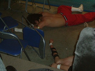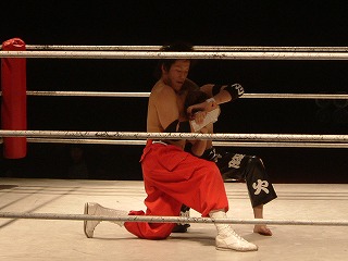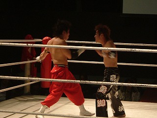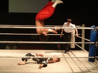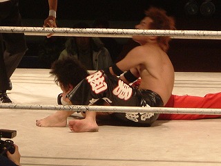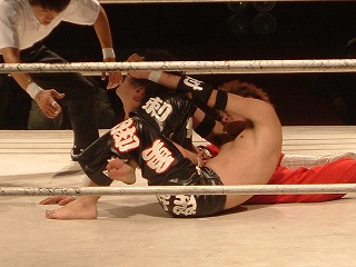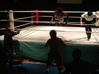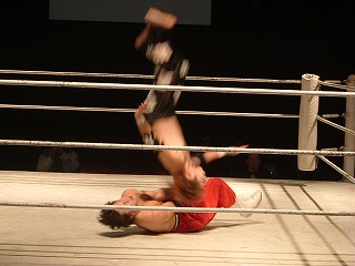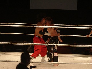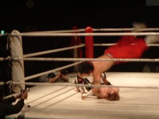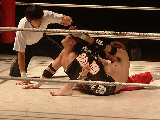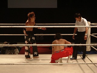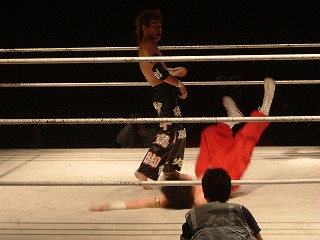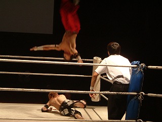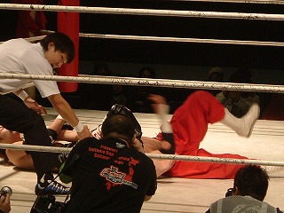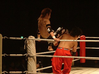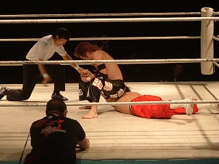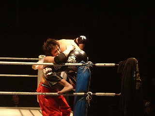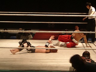 試合は予想以上のハードヒッティングな展開。終盤は一進一退の攻防ながら,体格で勝る宮本選手が微妙ながら押す。やはり体の薄いisami選手はダメージが大きいのか?最後は宮本選手の体ごと覆いかぶさるようなラリアットで両者ダウン。カウント10で立ち上がって来たisami選手でしたが,レフェリーはKOの裁定。予想外なKO決着となった。が,微妙な裁定に納得しない場内。でもね...KOですよ。立ち上がってもファイティングポーズや,闘う意思を明確に表示しなかったisami選手が悪い。あれはKOです。なので宮本選手の勝利です。