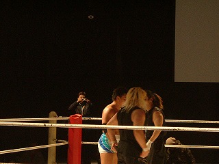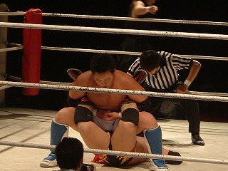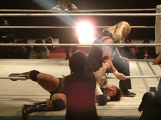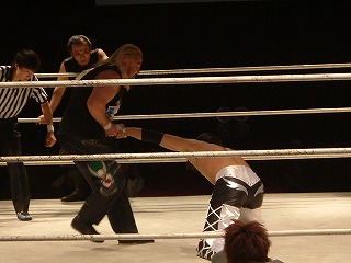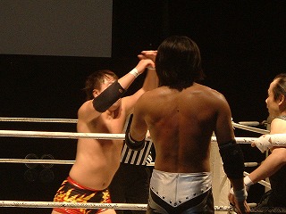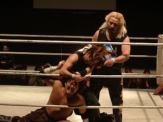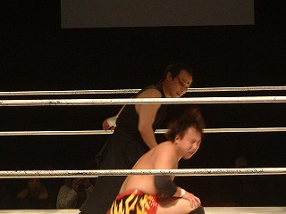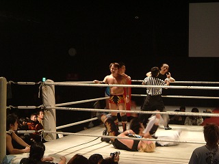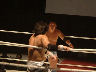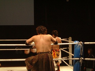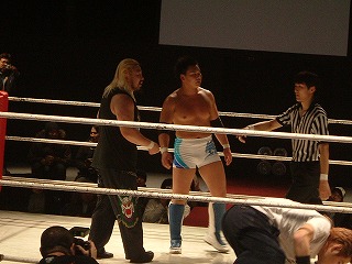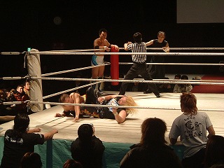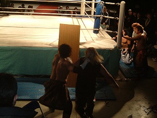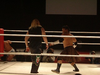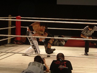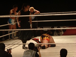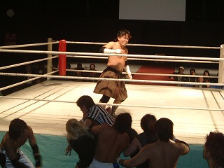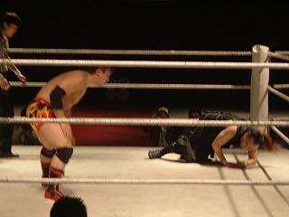 さて試合は終盤椹木選手がローンバトルをしいられました。なんとか反撃し交代するも,ダメージが回復する前に再登場。明らかに動きが落ちていました。ジャンプ力も半減してたし...もうちょっと休んでいれば...。その後も一人攻めまくられる椹木選手。自軍のコーナーからは厳しい激こそ飛ぶものの,カットにも入ってもらえず。それでも自ら肩を上げた耐えまくる。もう凄い頑張りに家内は反泣き,僕も声援に熱が入りました。なんとか自力でピンチを脱出するも,もう立ち上がる事も出来ない椹木選手。でも素晴らしかったです。この結果大事な勝負どころで2対3となった若手軍。最後は藤田選手がGOEMON選手も虚をついた雁之助クラッチに3カウントを奪われました。試合後は中嶋選手が四方に礼をしてさっさと去っていきました。そして雁之助選手がソルジャー選手に手を差し伸べる...が拒絶。そして,逆鱗に触れるソルジャー選手のマイク。すると雁之助選手が正真正銘の鬼神道へと変貌。雁州だか鬼神だかわからいけど凄い圧力。で,大乱闘がありソルジャー選手は結局流血KOされてしまいました。