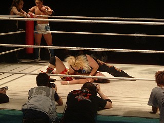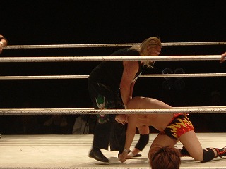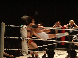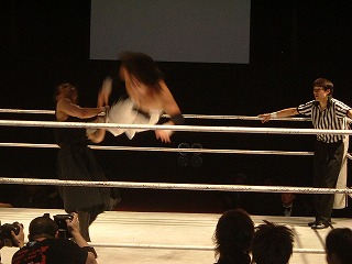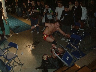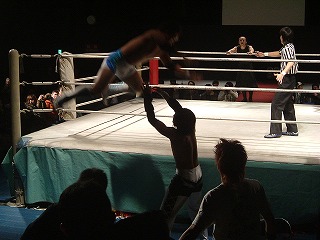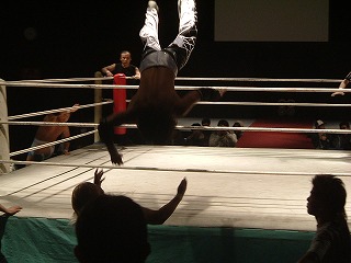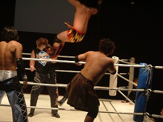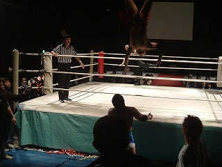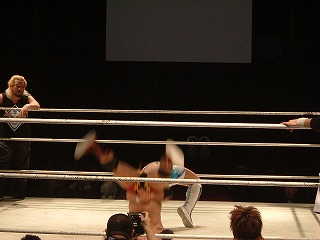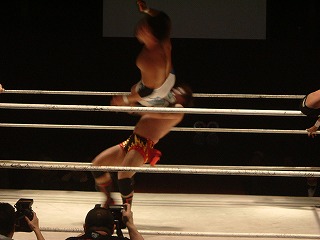 椹木選手は圧巻のトップロープからのラ・ケブラーダ