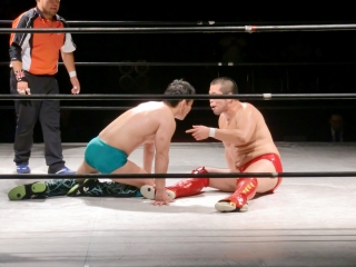 両者共レガースを着用し,寝技に重点を置きながらも,格闘プロレスを魅せる。